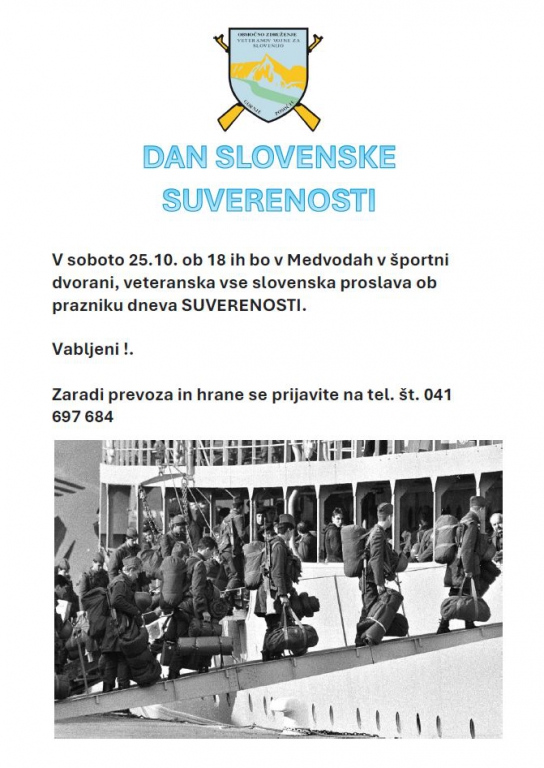 MEDVODEV soboto 25.10. ob 18 ih bo v Medvodah v športni dvorani, veteranska vse slovenska proslava ob prazniku dneva SUVERENOSTI.